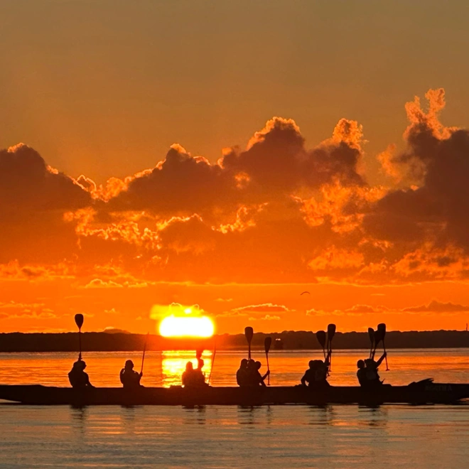Remada de aproximadamente 6 km (ida e volta), saindo da nossa base em direção à Ilha da Cotinga ou ao Cais do Porto de Paranaguá, variando conforme o melhor ponto para contemplar o nascer do sol.